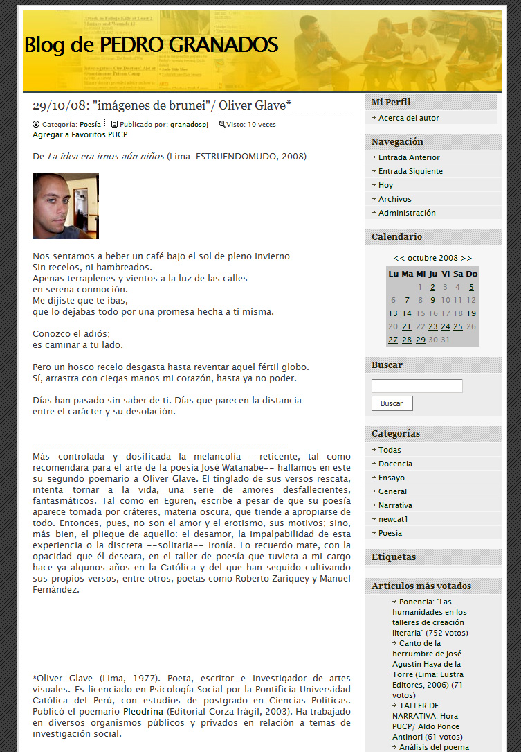 An archive of my work so far… Interviews WATCH ON YOUTUBE – Voyage Miami, 2019– Poetas Siglo XXI, 2012– ¡Oh! Palabras Vírgenes, 2010– Pedro Granados, 2008 https://afteralonghiatus.com/wp-content/uploads/2018/04/Proyecto-Latinoamericano-de-Unión-Poética-PLUP.mp3